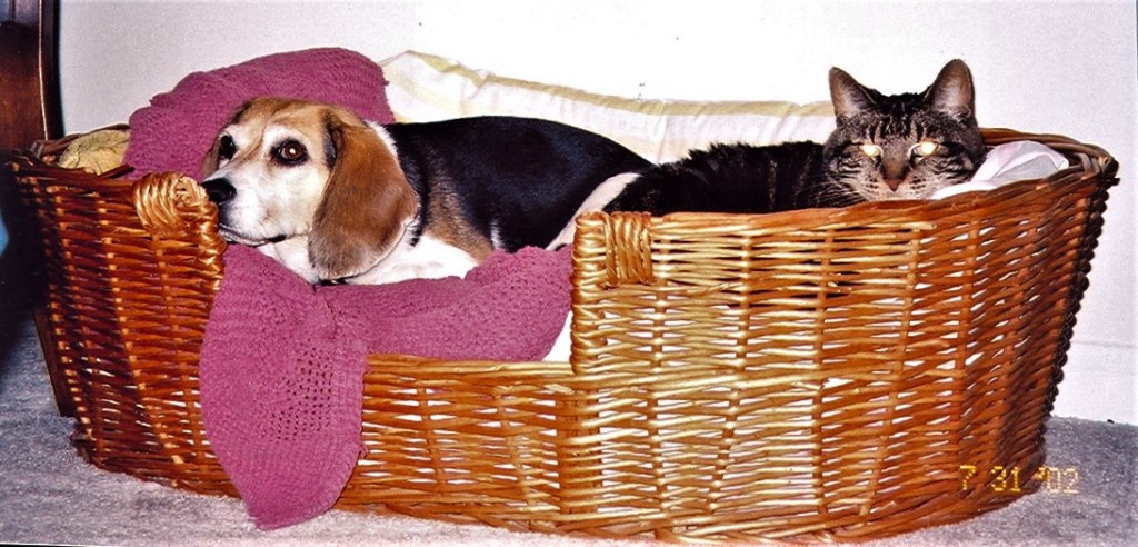 I acquired 3 more dogs over the next 9years, one of them being completely mesmerized by “Pesche.” Pescher hated everyone, including most people and a roommate during college. However, for some reason as much as she would swat and hiss at “Beth,” the Beagle, she began to tolerate Beth. Beth wanted nothing more than to have Pescher notice her. The swats and hisses did that. Each swat and hiss, “Beth” would yelp; which would in turn made “Beth”, get over-whelmed with excitement becasue Peshe had paid her attention, no matter if it was negative. Then she would love Pesche all the more. If anyone could have accomplished making Pesce tolerate and “love” as much as she was able to a dog, it was Beth.